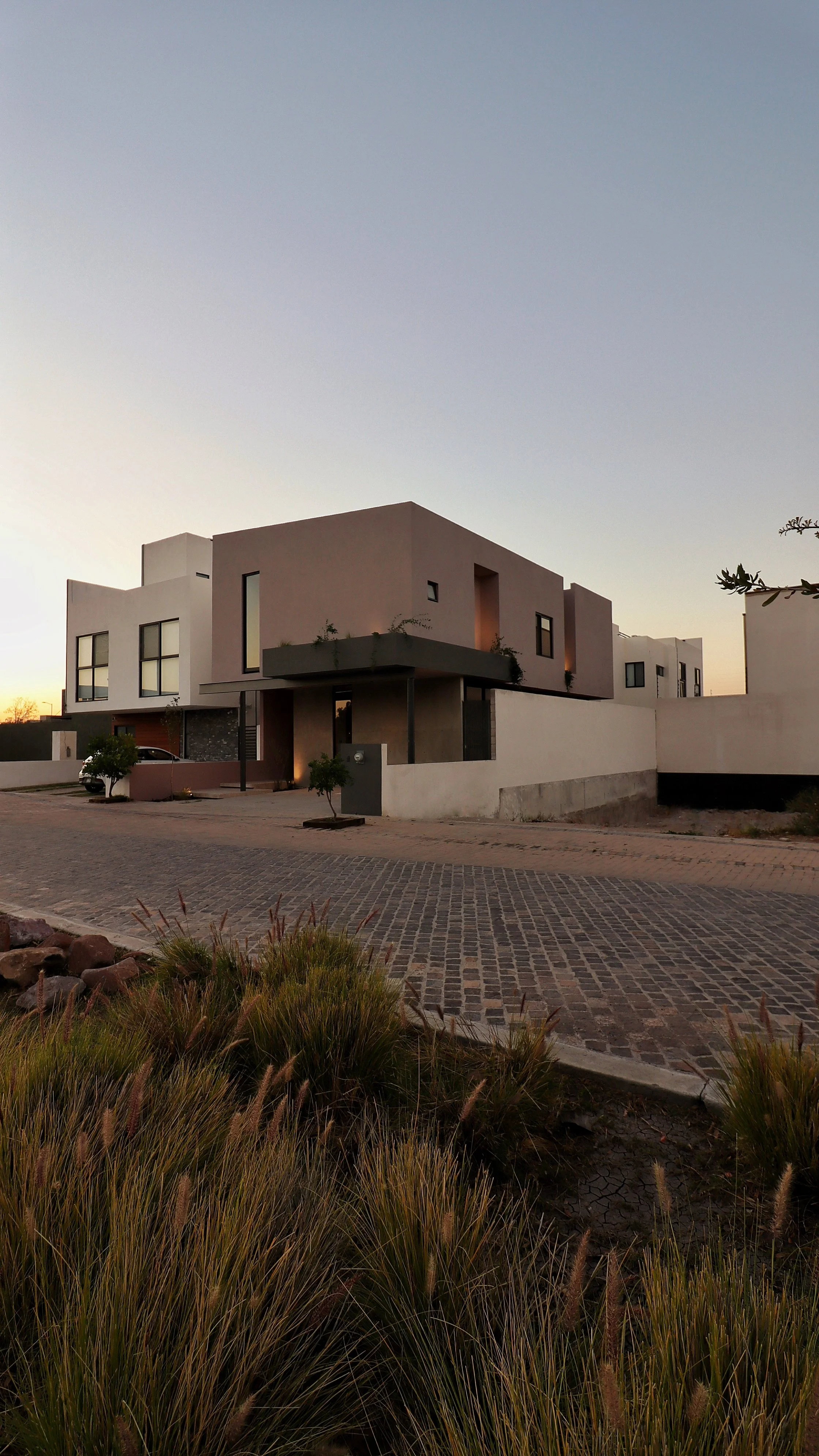 Casa habitación unifamiliar en el municipio de Corregidora, Querétaro. Cuenta con un pasillo lateral, así como con un estudio y patio en medio nivel inferior. Con la orientación bien estudiada de los espacios, el resto de planta baja se ilumina con grandes ventanales que a su vez ayudan a la ventilación y al mínimo uso de iluminación artificial o climatización.